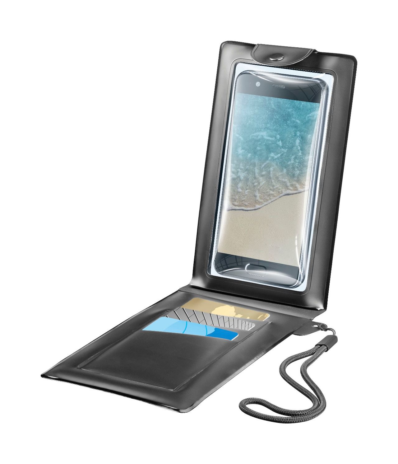 VOYAGER WAVE es la funda impermeable perfecta para utilizar el smartphone en la playa con total seguridad y confort, protegiéndolo de agua, arena y crema solar. Su material blando y ultraligero permite utilizar el smartphone de forma cómoda y manejable, sin perder sensibilidad en la pantalla. Posee certificación IPX8, lo que garantiza impermeabilidad al agua hasta 20 metros de profundidad. Aparte de salvar al teléfono móvil si se da un accidental chapuzón, le permite hacer fantásticas fotos bajo el agua. Incorpora una banda de agarre firme en la parte posterior para que los selfies salgan perfectos. Voyager Wave es compatible con teléfonos móviles de hasta 5,7”.