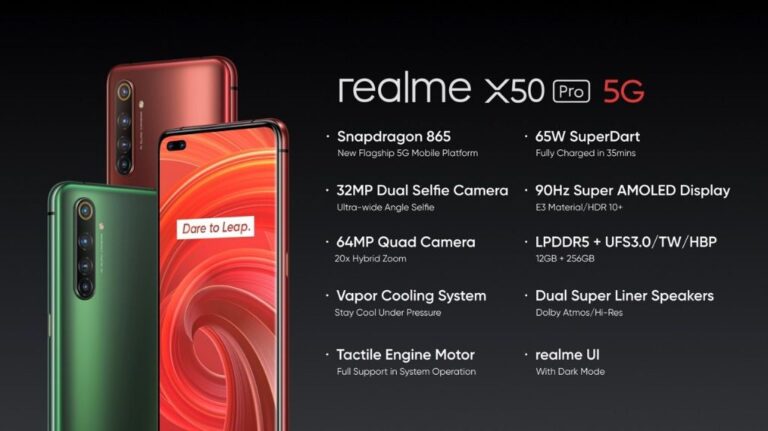 El realme X50 Pro 5G es uno de los smartphones que cuenta por primera vez con el procesador Qualcomm® Snapdragon™ 865 5G, que soporta la red Dual-Mode 5G. Además, cuenta con una cámara cuádruple Hawk Eye AI de 64MP, una cámara de 32MP ultra gran angular In-Display dual selfie, una pantalla Super AMOLED de 90Hz de frecuencia de actualización y una carga de flash SuperDart de 65W, que lo convierten en un buque insignia de 5G extremadamente competitivo con un excelente rendimiento.