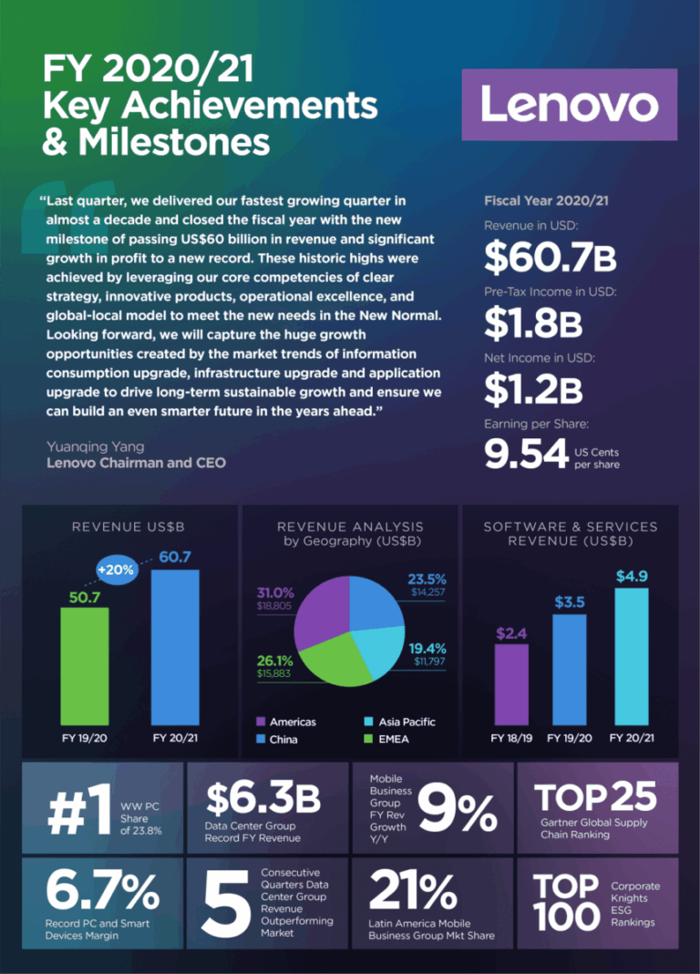 “Este trimestre hemos registrado el mayor crecimiento en casi una década y cerramos el ejercicio fiscal estableciendo un récord tras superar los 60.000 millones en ingresos y registrar un crecimiento significativo de los beneficios. Hemos alcanzado estos máximos históricos a base de aprovechar nuestras competencias clave; una estrategia clara, productos innovadores, excelencia operativa y un modelo global-local capaz de responder a las demandas de la Nueva Normalidad”, manifestó Yuanqing Yang, presidente y CEO de Lenovo. “De cara al futuro, continuaremos aprovechando las inmensas oportunidades de crecimiento que generan las tendencias de mercado como la mejora del consumo de información, en infraestructuras y en aplicaciones para impulsar un crecimiento sostenible a largo plazo que nos permitirá construir un futuro aún más inteligente en los años venideros”.